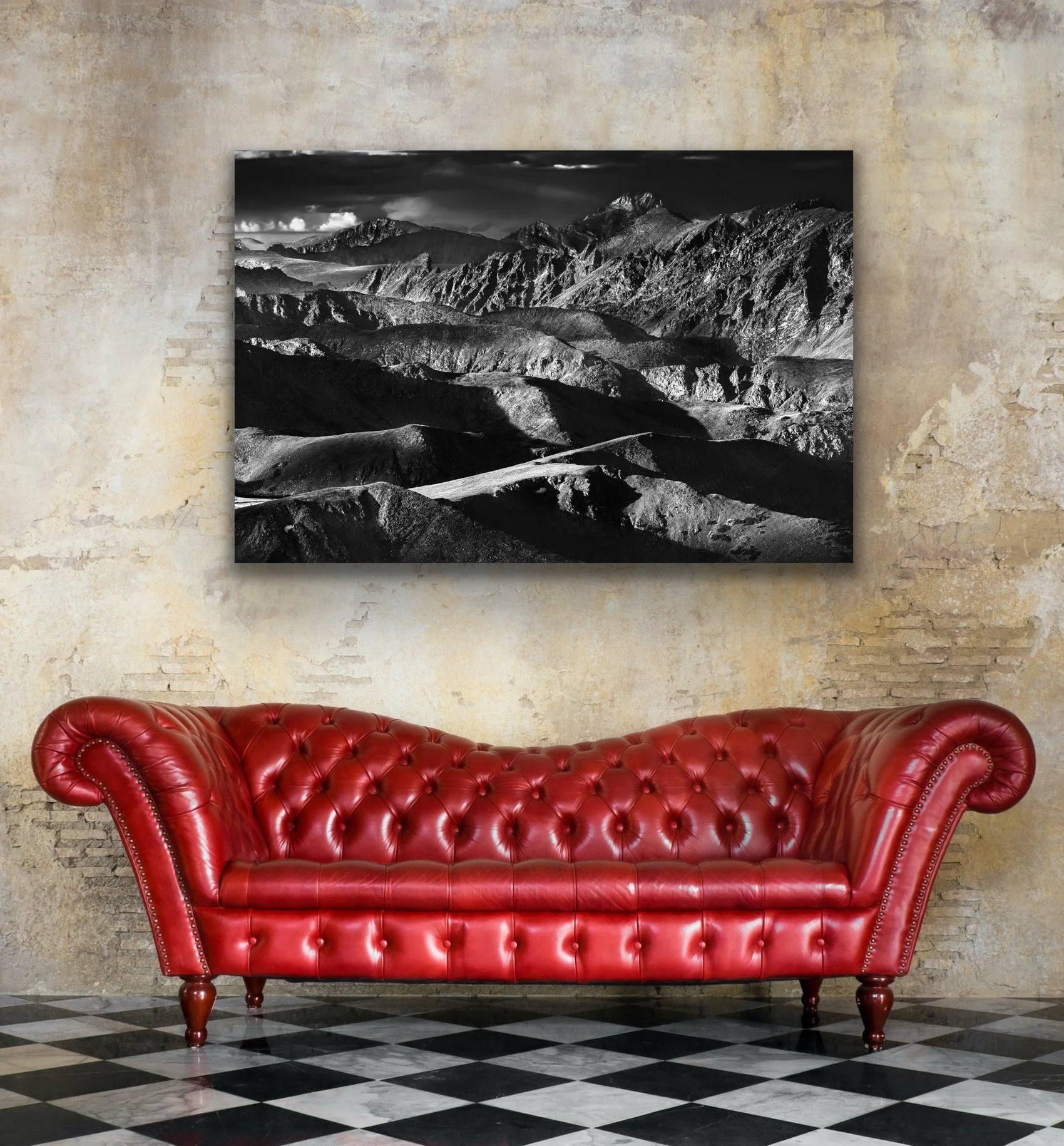Divided Wild is an image I created out of my ‘backyard’ in the Rocky Mountains of Colorado. Motorcycling directly from my cabin on a fall day, I zoomed up in elevation passing the changing aspens with golden glistening leaves and crested out above treeline - stopping just short of the wilderness boundary. Then climbed by foot through the alpine tundra with rust colored foliage leading into the barren rock scree of the high alpine. I summited ‘James Peak’ in the late afternoon, breathing heavy at 13,300 ft overlooking the surrounding peaks. The land here is the traditional homelands of the Nuuchu (Ute), Hinono’ei (Arapaho) and Tsistsistas (Cheyenne) peoples and known in modern day as the Colorado Front Range - a portion of Continental Divide. Spanning three distinct wilderness zones: James Peak Wilderness, Indian Peak Wilderness and Rocky Mountain National Park. The iconic 14k ft, Long’s Peak (Neníisótoyóú’u) towers in the distance, as a beam of light breaks through the clouds illuminating its summit block. This image inspires the eye to evaluate the detailed complexity of the intensely rocky and layered terrain with a seemingly never ending ridge system. The land emanates a sense of lostness and impassability. I find myself searching for traversable routes, while becoming wrapped up by the deep shadowed valleys, wondering what each one may contain in its own vastness.
