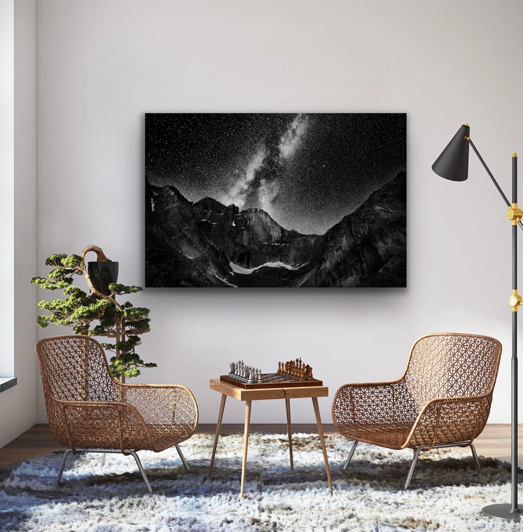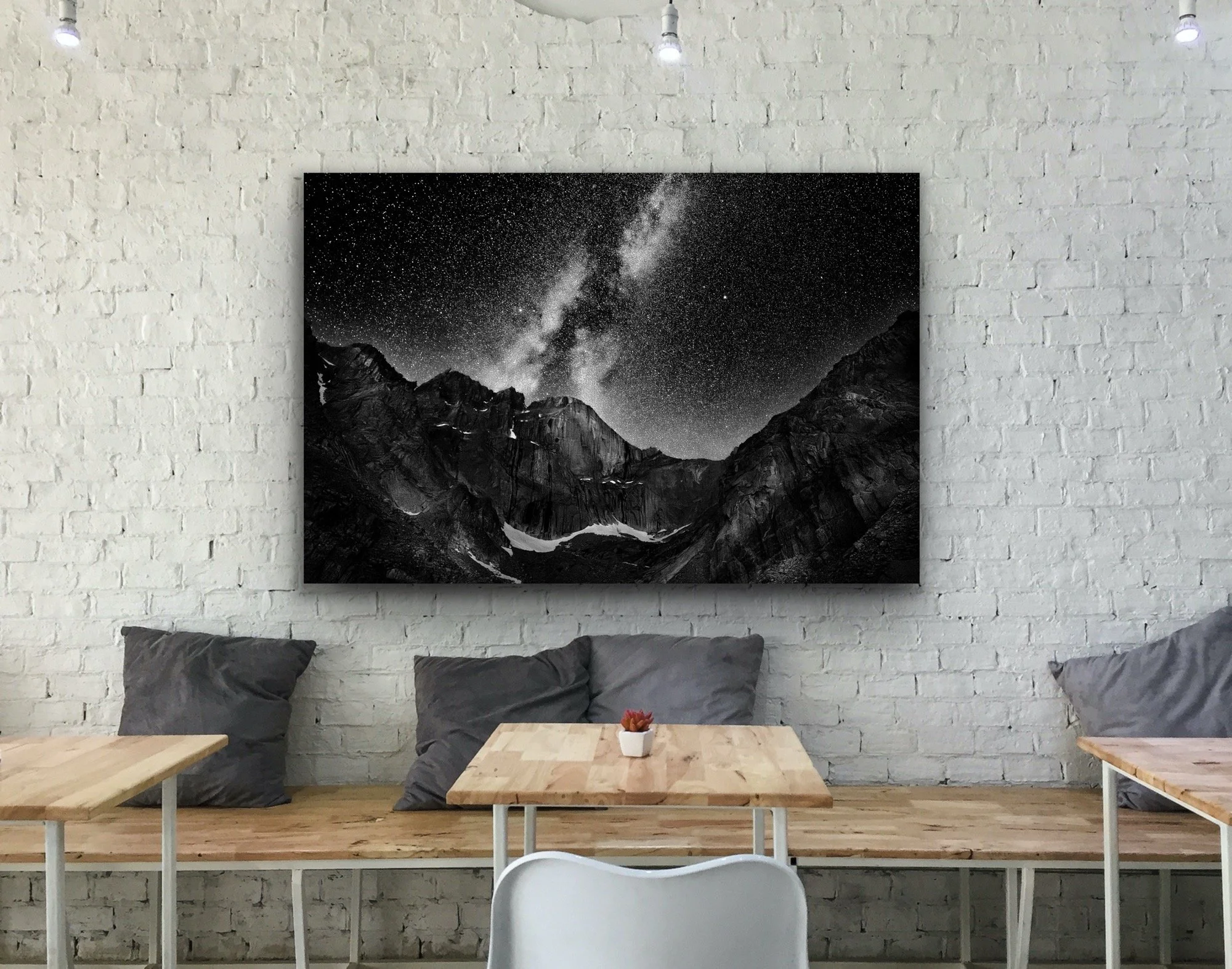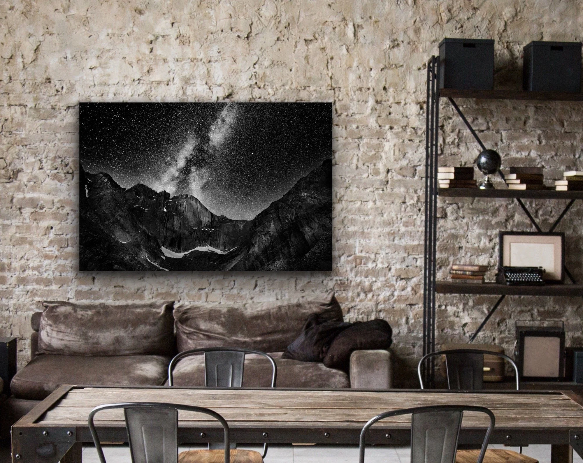 The towering 14k ft Long’s Peak (Neníisótoyóú’u) dwarfed below the galactic scale of the Milky Way Galaxy exploding from its summit block. A powerful black and white piece demonstrating relative scale, reach and immensity.